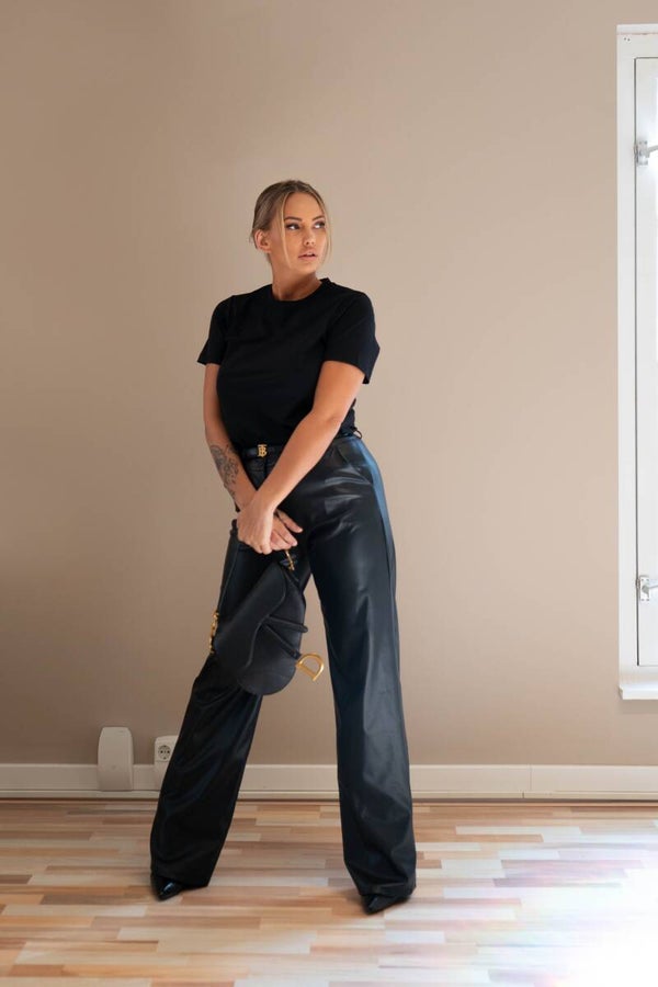 Dankzij de hoge taille en de rechte pijpen sluit hij prachtig aan bij vrouwelijke curves en verlengt hij optisch je benen. De PU-leren stof voelt soepel aan en beweegt moeiteloos met je mee. Combineer ‘m met een strakke top en blazer voor een classy avondlook of draag hem casual met een oversized sweater en sneakers.
