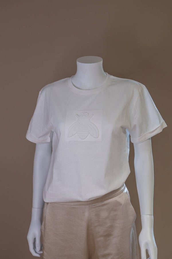 Clean, classy & herkenbaar. Dit witte T-shirt met embossed bij-logo van Melissa Oosterwolde is dé ultieme basic met karakter. Gemaakt van een zachte katoenmix en afgewerkt met opgerolde mouwen en een minimalistisch 3D-bij-detail in ton-sur-ton.